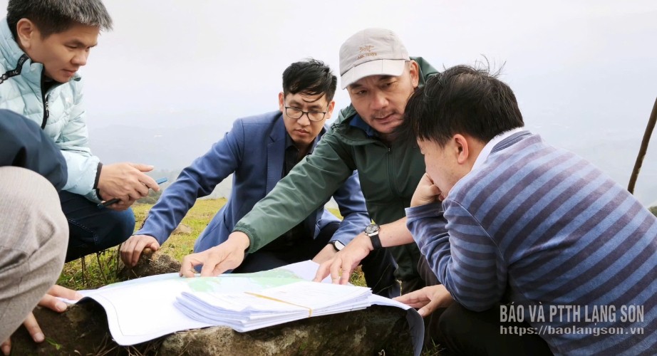 Các thành viên Đoàn công tác rà soát phạm vi ranh giới khu vực ga trung chuyển tại núi Phặt Chỉ